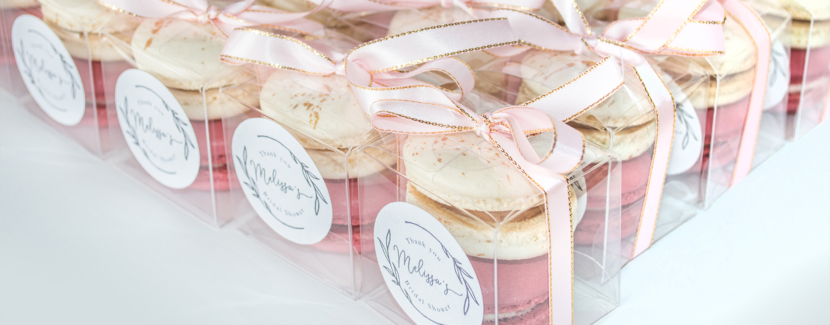 Macarons in a clear box with gold ribbons to as a favor for all the guests for a beautiful wedding.